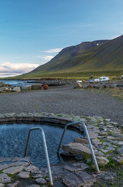 Grettislaug, ein natuerlicher Hot Pot direkt am Meer, mit Blick auf die Insel Drangey